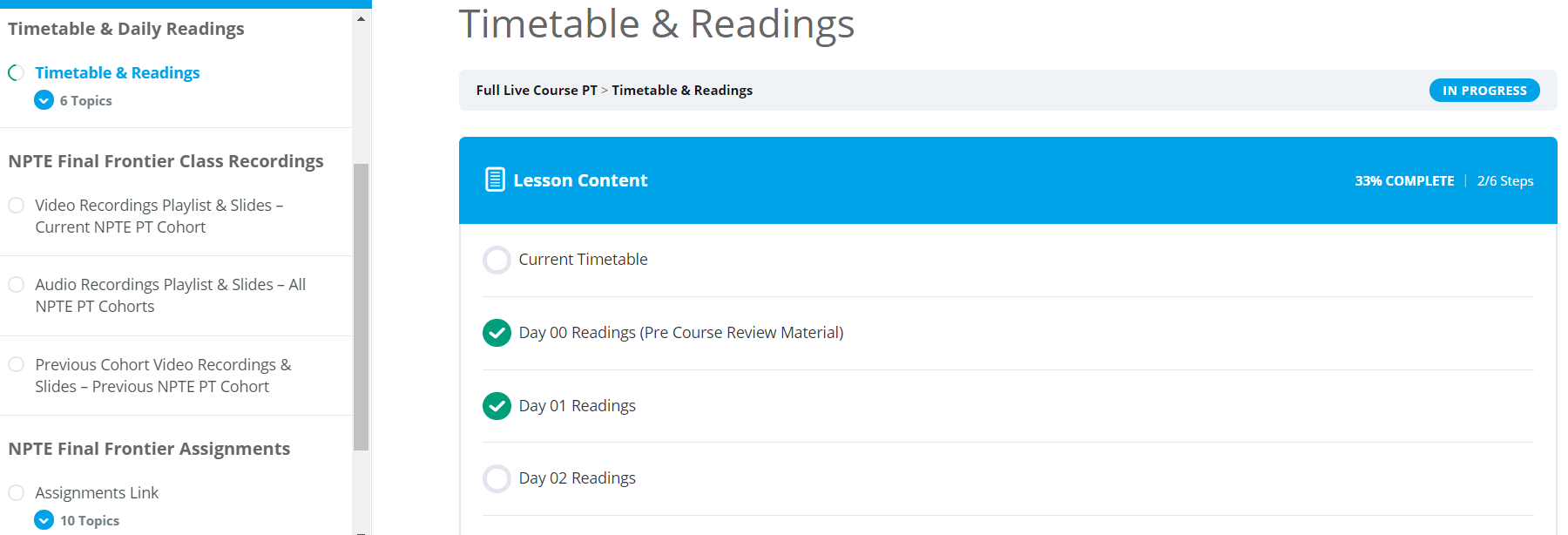 Our live online lectures are take place on Tuesday and Thursday at 5PM PST and Saturday at 8:30AM each week (~3x/week) and the recording will be posted on the course page within 1-day of the live class. The full lecture series provides over 30 2-hour video lectures, all aligned to current NPTE standards.